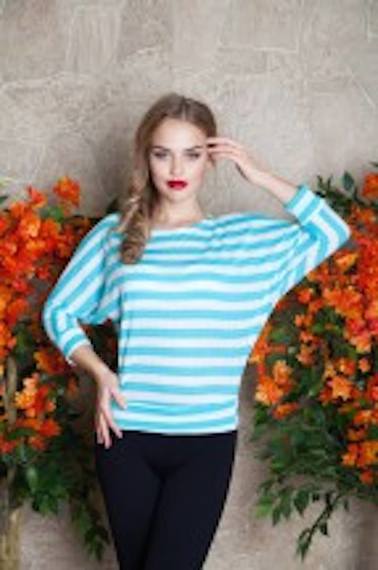 Летняя блузка в полоску голубого цвета. Крой укороченный с широкими рукавами "летучая мышь" и круглой горловиной.