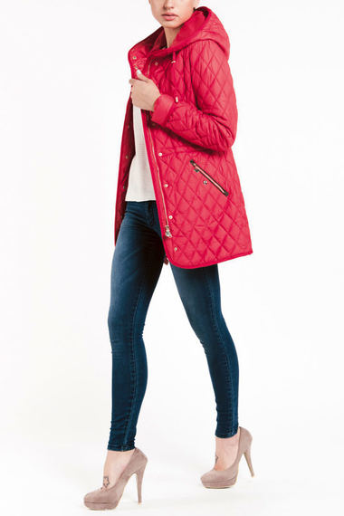 Стильная и удобная демисезонная куртка красного цвета. Модель на синтепоне, удлиненная, с поясом на кулиске, прорезными карманами по бокам и большим капюшоном.