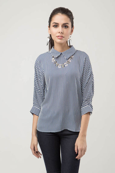 Блуза в тонкую вертикальную черно-белую полоску. Имеет классический воротник и рукава три четверти. Бижутерия в комплекте!